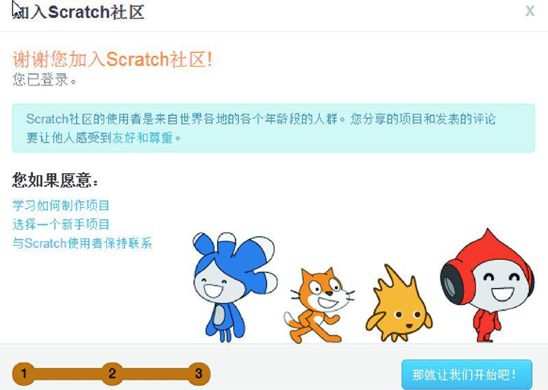 首先单击图1.10所示“那就让我们开始吧!”,可以自学Scratch的用法。提醒读者注意的是,Scratch语言非常适合自学,如果在阅读本书的过程中,能够在Scratch网站上自学一些别人编写的程序中的技巧,将会极大地提高编程水平。
