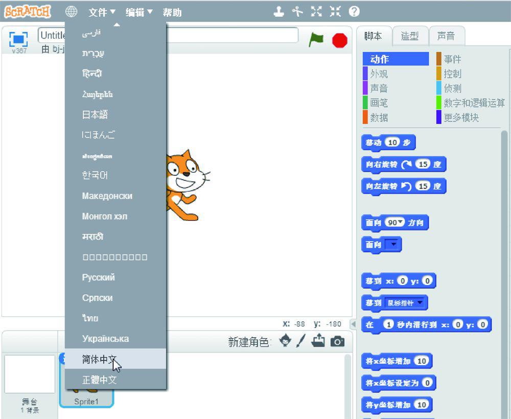 根据Scratch网站上提供的教程,可以一步一步地完成一个最简单的项目,但是教程中的图片目前还是英文的。编程界面也是英文的,如图1.12所示,可以通过语言选项来变换语言,Scratch支持二十多种语言。之前有瑞典的老师和学生访问笔者的学校,他们并不懂得中文,英文也不是很好,但是他们仍然可以用瑞典语版本的Scratch来学习编程,因为语言虽然不同但是思维是相通的。
