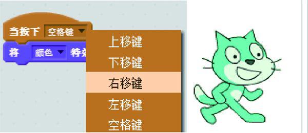和上面的代码一样,也需要一个启动颜色改变代码的事件,选择“当按下右移键”事件作为触发条件,如图1.17所示。按键触发条件的默认值是空格键被按下,可以试一试,按下右移键时小猫的颜色发生了怎样的变化,如果按住右移键不放小猫的颜色又会有怎样的变化,按多少次右移键小猫的颜色才能回到初始的状态。