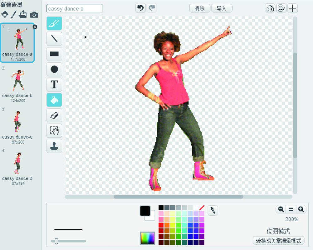 从素材库选择一位跳舞的女生(Cassy Danceing)和小猫一同起舞,如图1.23所示,她存放在人物类素材中。选择成功后,新角色就站在舞台中央了。