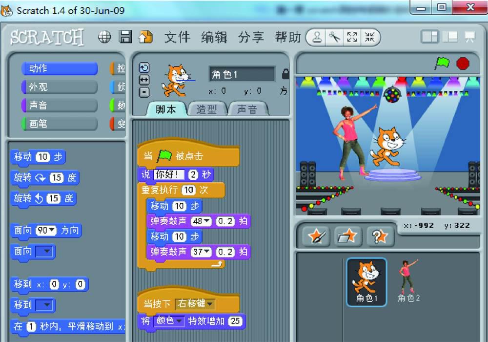 事实上,上面的代码同样可以通过Scratch 1.4来完成,如图1.33所示,Scratch 2.0和Scratch 1.4的代码都是通用的。本书会同时用到Scratch 2.0和Scratch 1.4,因此可以通过把上一节的程序在Scratch 1.4中改写来学习Scratch 1.4。