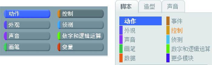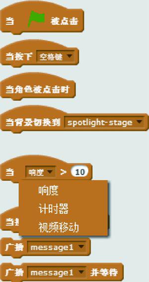 事件类的具体内容如图1.35所示,与Scratch 1.4相比,增添了“当背景切换到”和“当响度大于……”两个代码,更方便编写一些小游戏。