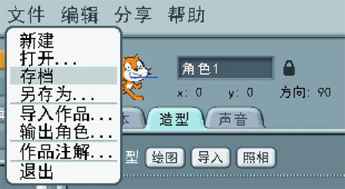 Scratch 1.4要将文件保存在本地,需要选择“文件”菜单的“存档”命令,如图1.39所示。