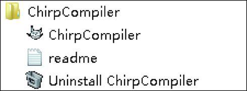在没有安装Scratch的计算机上,无法直接打开使用Scratch制作的扩展名为.sb的文件,此时就需要将程序源文件发布为扩展名为.exe的可执行文件,以方便分享或发布。首先需要将Scratch源文件的文件名改为英文字母并保存。安装Scratch2exe程序,该程序也称为ChirpCompiler,见图1.51,由Scratch的另一个版本BYOB团队开发。