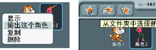在Scratch 1.4中,从另一个程序中复制一段代码的方法是:先输出含有代码的角色,然后再导入到另一个程序中,如图1.45所示。
