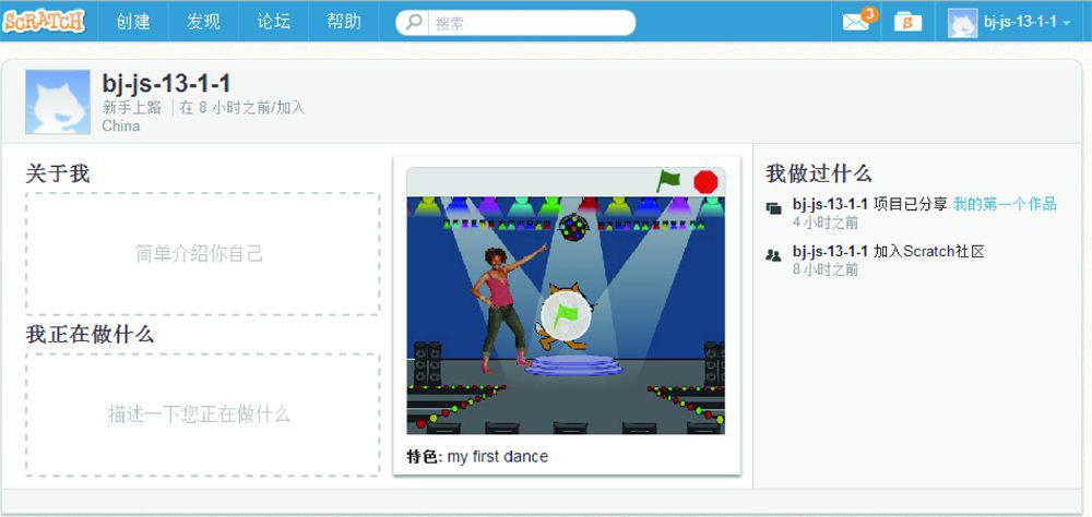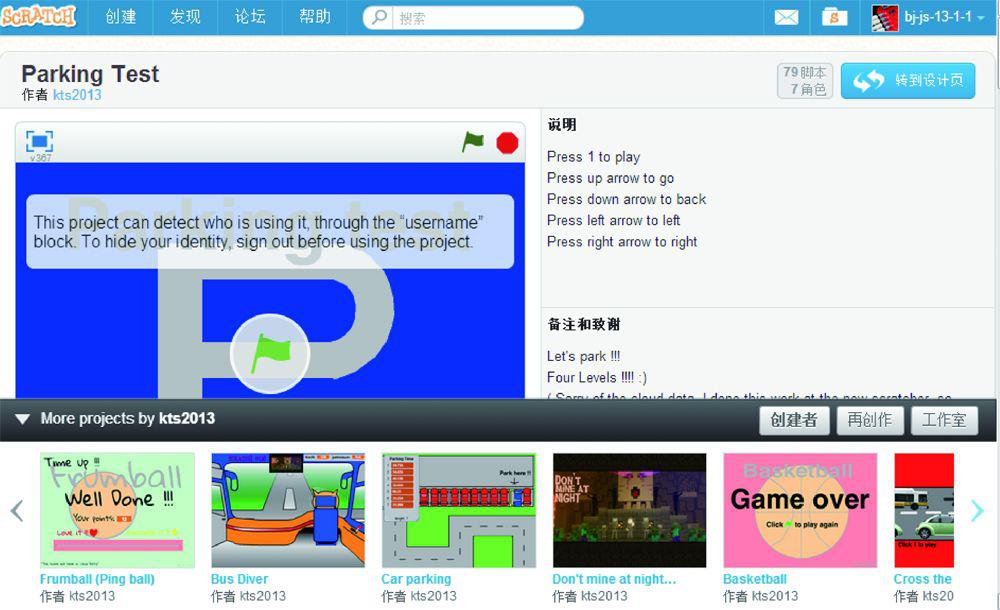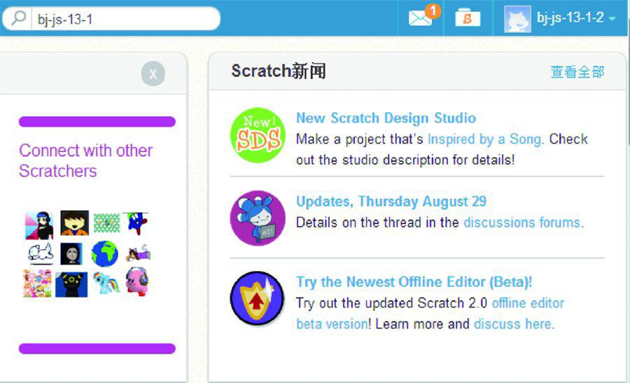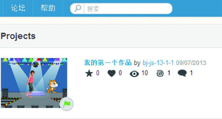 在Scratch网站中,最重要的功能是能够结交许多朋友,结交朋友最好的方式是,查看别人的程序并且提供中肯的意见。首先,如何找到其他同学的程序呢?使用用户名搜索是一个好方法,如图1.53所示,登录以后,使用bj-js-13-1作为搜索词可以找到所有同学的作品,如图1.54所示。