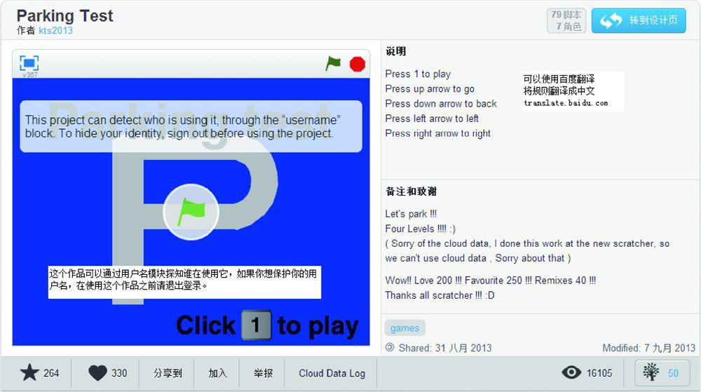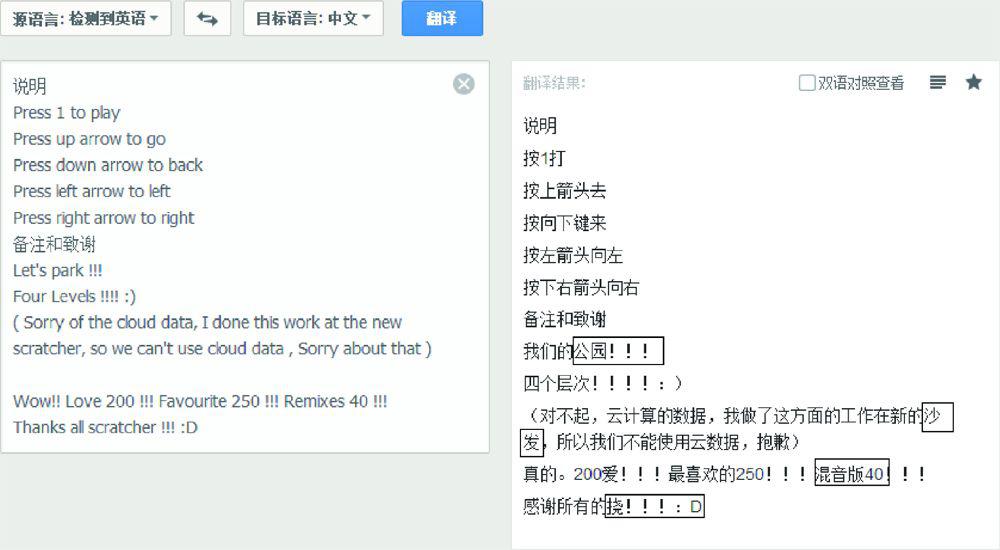 在线翻译常常会出错,比如图1.67中黑框的部分翻译有误,但是一般来讲,游戏规则的翻译一般都是正确的,至少可以通过翻译来试玩一下这个游戏(图1.68),游戏地址:http://scratch.mit.edu/projects/11704649/。