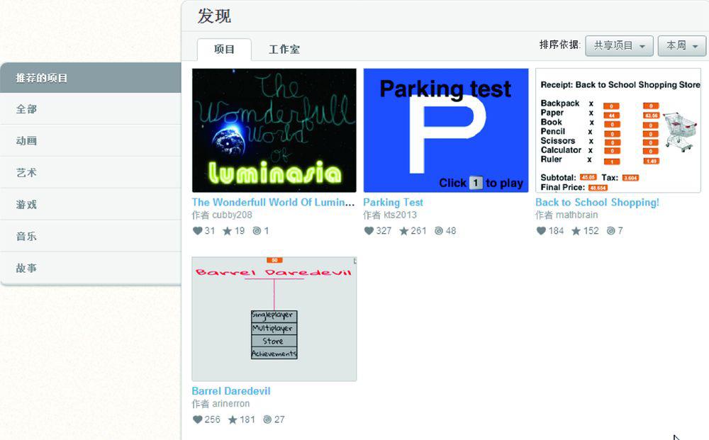 单击上面的Explore可以看到目前Scratch的各个分类的典型作品,如图1.65所示。