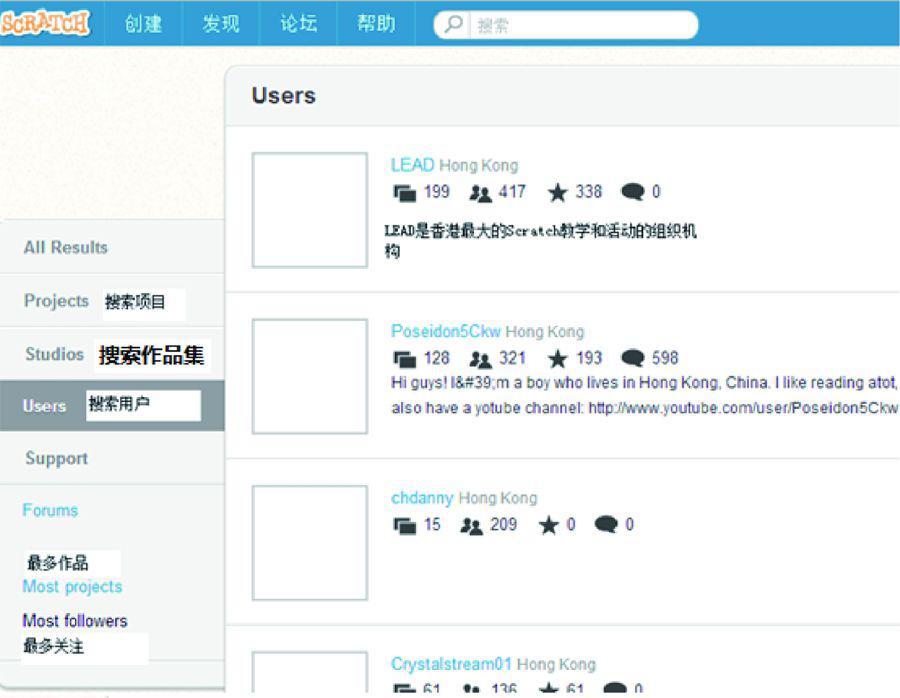 从作者信息中可以看到,该作者来自香港(Hong Kong),这说明他应该能够读懂中文,因此可以试着和他用中文联系。此外用“Hong Kong”作为检索词,可以看到很多中文的Scratch作品。还可以通过用户名检索,找到更多附近的Scratch爱好者(Scratcher),如图1.75所示。