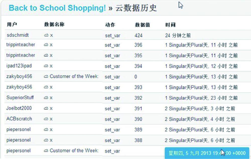 比如作品:学校购物车(http://scratch.mit.edu/projects/11820991/),每周会随机地生成一个中奖的人,参与抽奖的人的个人信息和是否中奖的情况将会显示在云数据列表中,如图1.71所示。