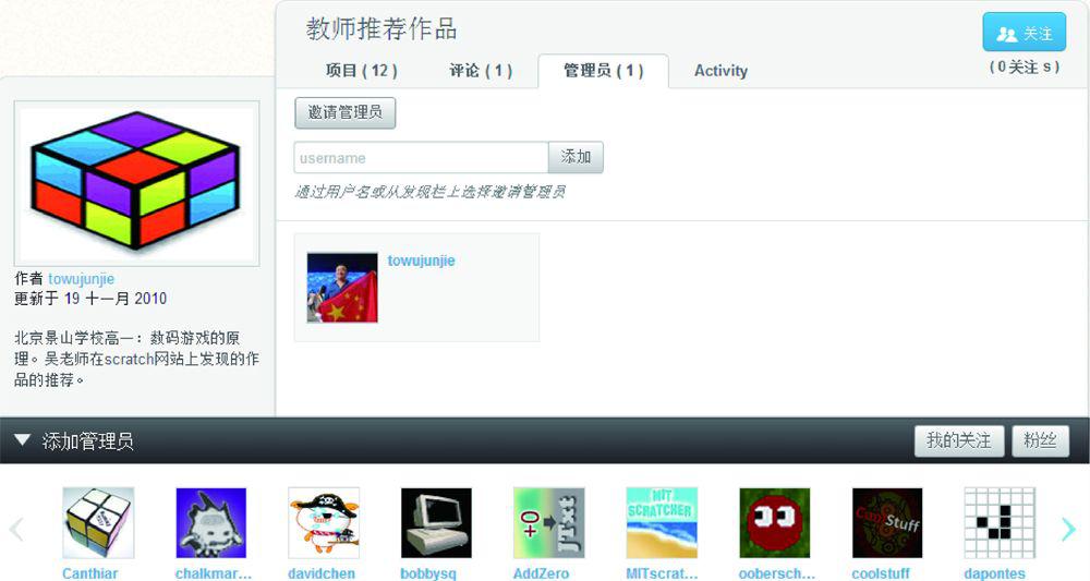 管理员可以通过用户名输入,也可以添加自己的好友为管理员。此外,教师推荐作品的评论显示了用户对该作品集的评论,Activity的意思是一个日志,添加作品的操作会记录在日志中。