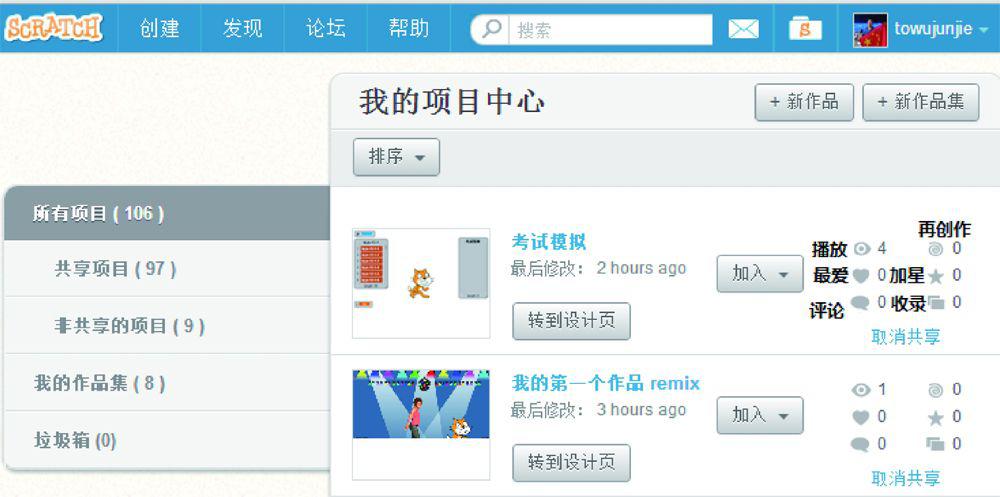 建立作品集的目的是将自己或者他人的Scratch作品整理归类,图1.62中既有自己的作品,更多的是将他人的作品结集成册,因为大部分时间都是在Scratch网站上浏览作品,如果看到好的作品,迅速整理在作品集中,或者和作品的作者成为好友,将会在很大程度上提高自己的Scratch水平。