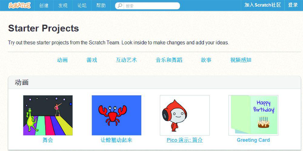 可以看出,这些入门案例包括动画、游戏、互动艺术、音乐和舞蹈、故事及视频感知6个门类,接下来将讲解这些基础案例,以此来给出一个比较扎实的Scratch语言的基础,为接下来学习感测与控制技术做一个铺垫。