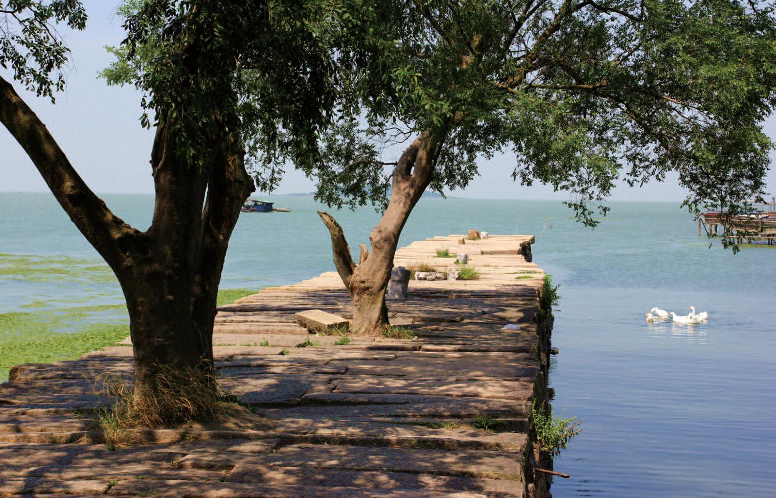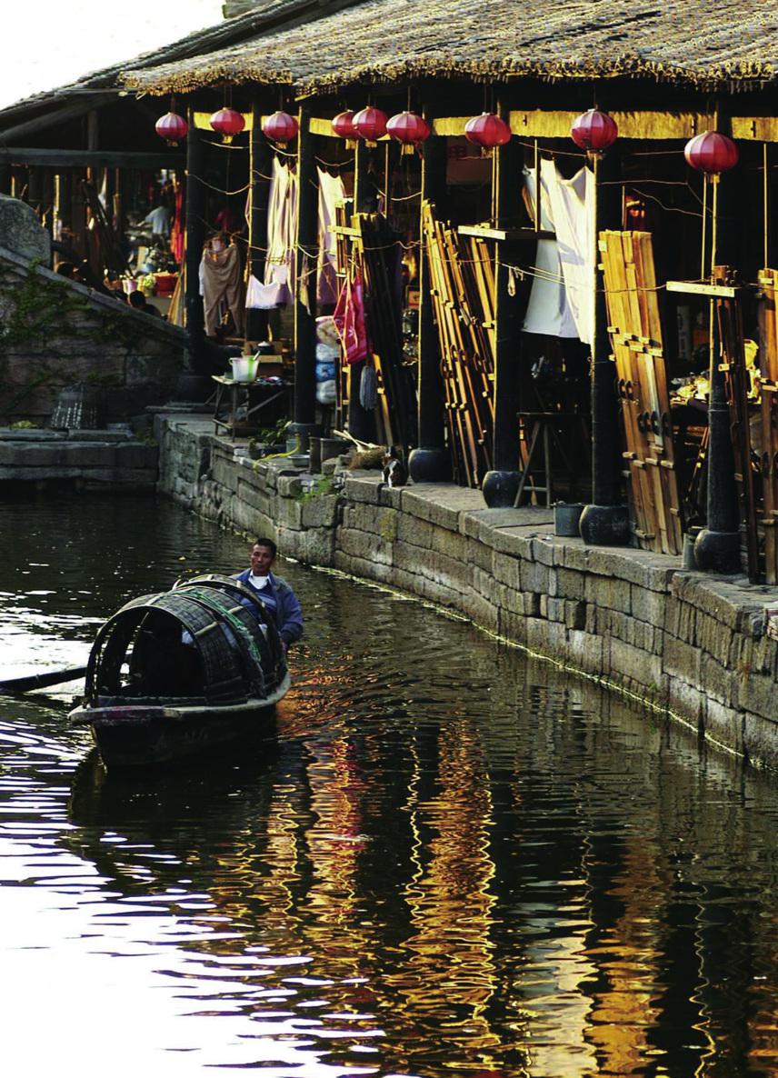 此处的“轻舟八尺,低篷三扇”指的正是乌篷船——八百多年的桑田沧海之变,斯船大致依旧如初:船身瘦长,前后两端略上翘,居中构筑半圆弧状的“低篷”。船有大小之别:小者驾驭时属手脚共用式,前行之力来自双脚躅桨,手控木桨功在助力和调节方向:大者可容数十人,考究者亦用贝壳片镶嵌拼装在低篷中,熠熠闪烁,使舱内趋于亮堂。与大多数的越房鉴屋一样,乌篷船通体黑黝,全无色彩。