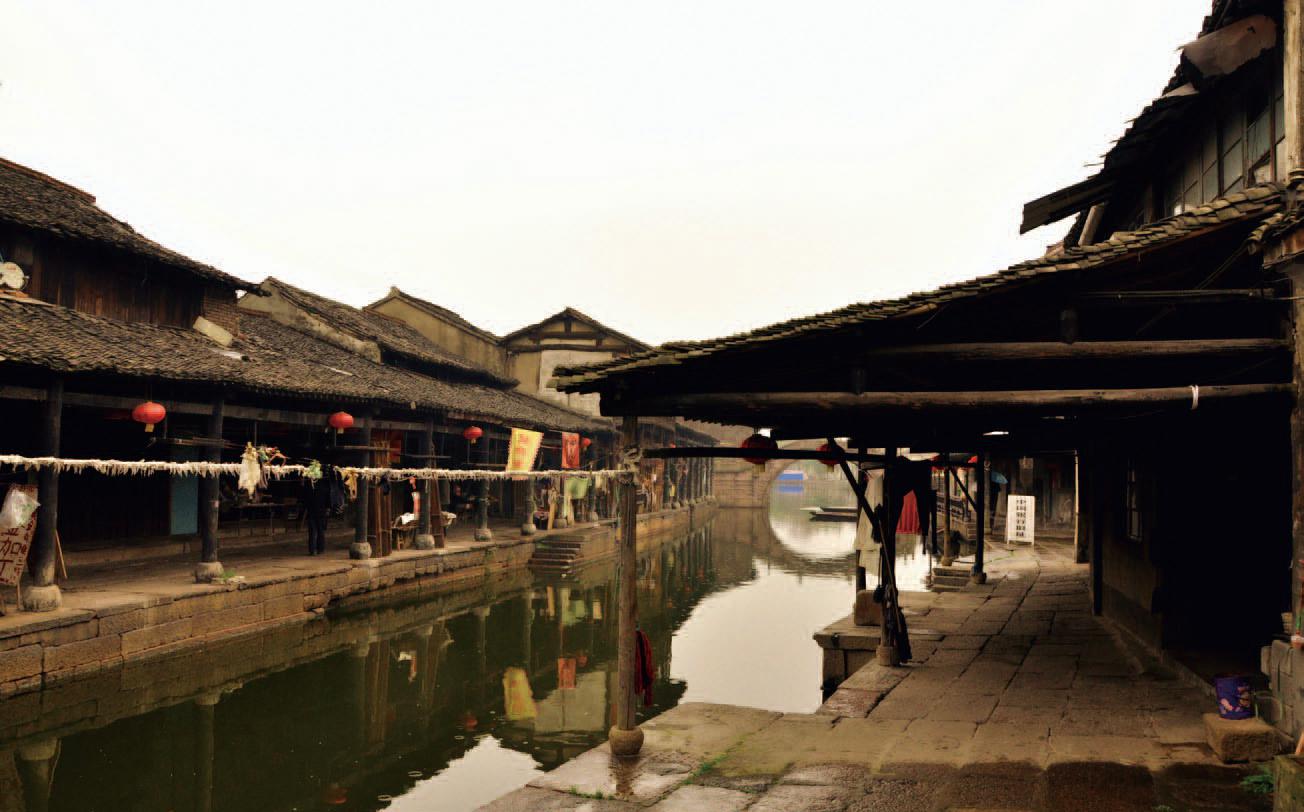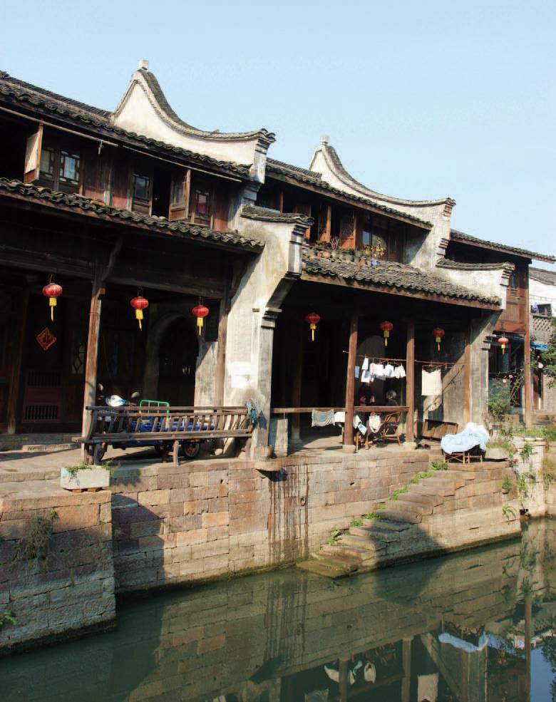 除了在主航道和镇区边缘设置公共水埠和码头外,也在镇区河道中视具体布置若干,便于舟楫深入市镇中心处,如乌镇车溪河中就安排了相应的设施裨于商家就近装卸。总之,市肆繁华处的公共水埠着眼于便利货物装卸,往往设置于较大规模的店铺、商行和桥梁相连接之处,依赖和呼应商业之需以提高效率。基于装卸作业的需要,对河道的宽度也有一定的要求,于是,往往在大型水埠处设有“转船湾”——一定宽幅、供舟船停靠调头的河道交汇处。转船湾的平面以袋形居多:一端弗通船只,二或三面以建筑或堤岸围合而成;另一端或两侧与市河连通,其功能和平面组织好比陆地之广场,绍兴县一带大都称这种格局和形式为“溇”。规模小型者如周庄镇北市街张厅后院的箸泾,其中段拓宽为方形用于小舟交会或调头;规模巨者如乌镇西栅的转船湾,三面围合处前水埠踵接,且尺度阔大,可接纳数条舟船同时装卸、掉头和转向航行。