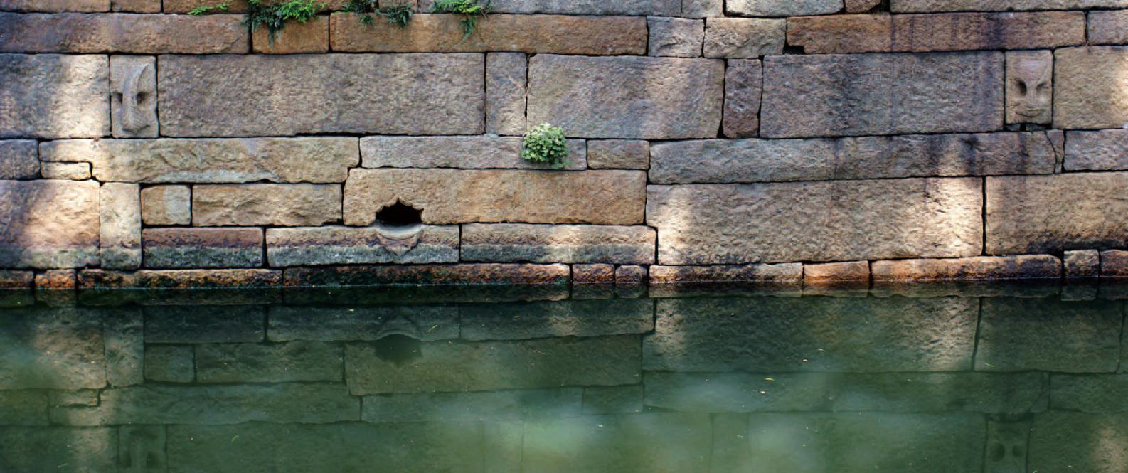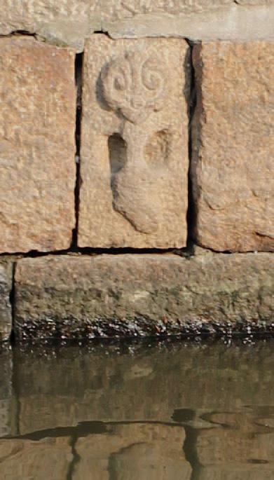 以块石条石砌成的水巷驳岸通常以粗硕木桩夯底、密排,上面铺敷石板,沿河边沿再以条石骑缝安装、砌筑和凿齐,条石或石块之间留有一定缝隙,便于洩水泄水;根据河岸居家之需,抑或留有孔洞充作下水道的出口,或砌成供上下的石阶水埠。驳岸边沿如无水埠等设施,亦往往竖起条石,上端凿孔、内穿竹杆或木棒连接,形成街巷和水道之间的安全栏杆。如周庄镇中市河南端接梯云桥处、甪直镇等处,均大致如斯。太湖流域市镇的驳岸边界距临河人家距离一般为2~3米,绍兴地区市镇宽度多为4~8米,保证行人通行等之需。甪直镇驳岸总长1000余米,部分商铺和缙绅之家门前的驳岸砌筑十分讲究,石级大而平整,拼缝精细,如南市下塘街的“万盛米行”、西汇上塘街的沈柏寒宅、中市上塘街和丰桥南的萧宅以及中市街6号王韬故居等。甪直镇南市下塘河、兴隆桥堍的万盛米行前,宽约4米的河埠依河后退而砌,六级石级上直达米行,用于装卸谷米。吴江黎里镇T形的市河驳岸风貌依旧,石岸总长5200米,其中明、清时建的驳岸数量众多,凿錾细密,一般多以纵长方形花岗石为主,通常在岸壁上还嵌有排水口和缆船石。芦墟镇的排水口上端錾成莲花壶形,煞是美观。缆船石约一尺见方,设两个对穿的孔,孔洞上雕镂寓意吉祥的图形。如甪直镇的蝙蝠、奔鹿、立鹤、寿桃、梅花、蕉叶、双榴和莲花、葫芦、刘海戏金蟾、香草、连结、猫眼及狮子滚绣球等,样式丰富;黎里镇的缆船石如瓶盛三戟、如意蹲鹿、单双犀角、笔锭如意、双桃、双橘、经幢、佛手、如意等图形,布局上横式、竖式多样,工艺上浮雕、阴刻不一。现甪直镇尚遗有50余个形态较好的缆船石雕。