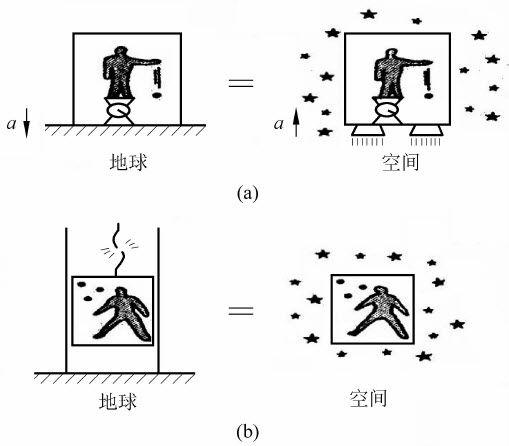 (a)引力与加速:左边表示升降机在星球(例如地球)表面静止,右边表示升降机在太空中加速;(b)自由下落与失重:左边表示升降机在星球引力场中自由下落,右边表示升降机在太空中作惯性运动