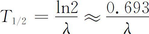 即放射性核素的衰变服从指数衰减规律。放射性核的数目衰减一半所需要的时间称为该核素的半衰期(half-life),用T 1/2 表示,显然: