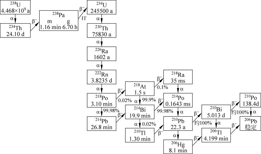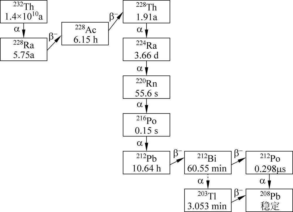 放射性核素母体衰变成的子体核素也可以是放射性的,要衰变成第2代、第3代的子体。这些放射性子体一方面由母体生成,一方面又衰变成下一代子体,形成衰变链,直到稳定核素为止。在天然锕系元素和重核裂变反应初级产物中都存在这种衰变链。3个天然放射性衰变系,分别从 232 Th、 238 U、 235 U开始,终结于 208 Pb、 206 Pb和 207 Pb,见图1-2~图1-4。