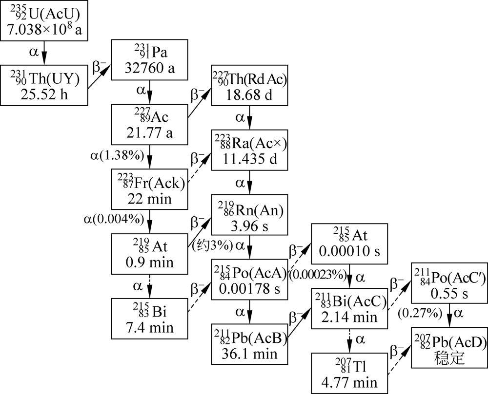 在3个天然放射系中,由于原始母核的半衰期比各代放射性子体都长得多,放置足够长时间后(如寿命最长的子体半衰期的10倍),整个衰变链处于长期平衡状态,即母核以恒定的速度衰变,各代放射性子体核的生成速度与裂变速度相等,且等于母体的衰变速度,也就是说各个放射性子体的活度都等于母体核的活度,而它们存在的原子核数则与其半衰期成正比。因此,一些较长寿命的子体,如 231 Pa、 230 Th、 234 U、 226 Ra以较大的量存在,而很短寿命子体的量是微乎其微的。
