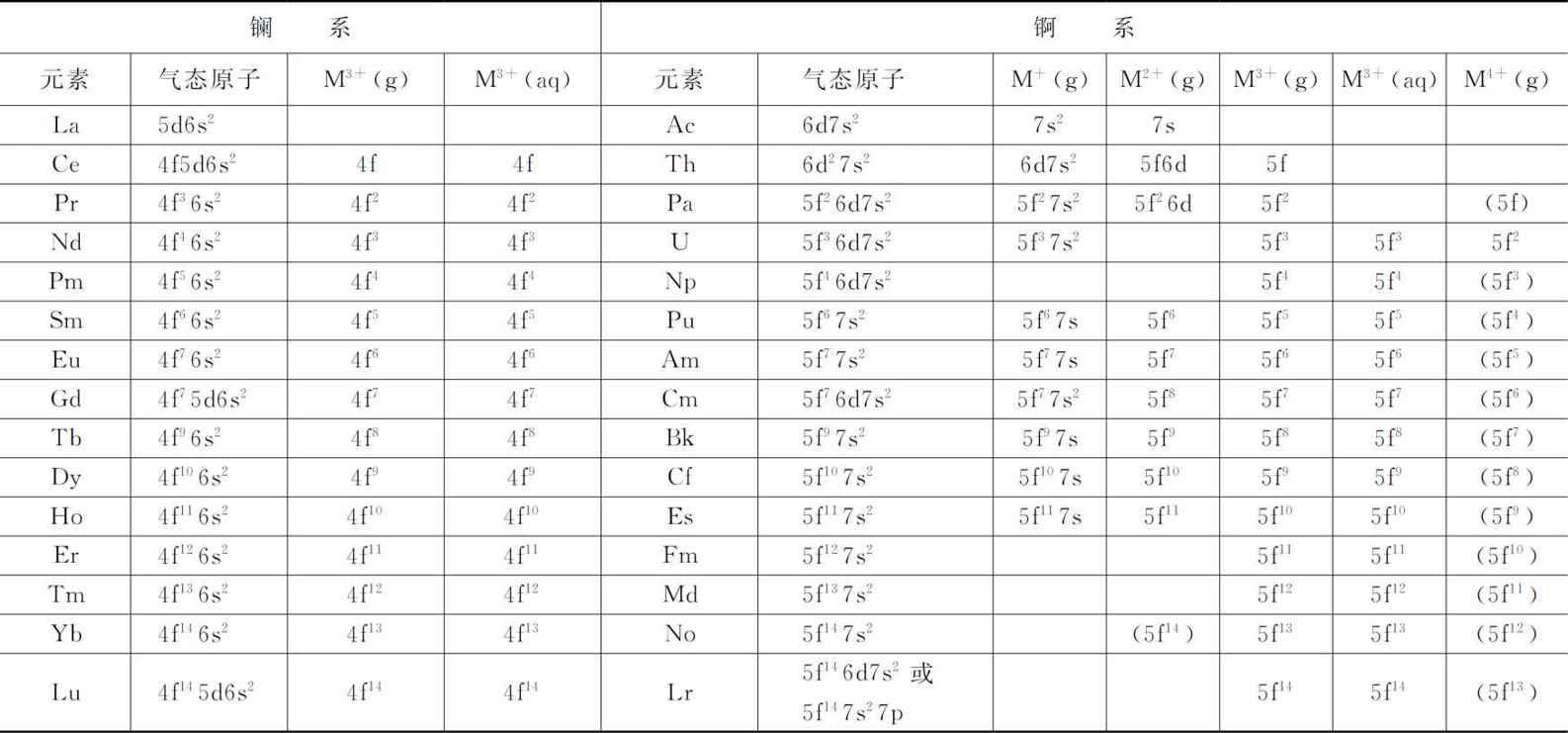 原子电子构造的信息可以从原子发射光谱、X射线光电子光谱、电子顺磁共振、电子转移光谱、晶体结构数据等手段获得。研究结果表明,在镧系中,从铈(Z=58)到镥(Z=71)电子逐个加入4f电子层;在锕系中,从钍(Z=90)到铹(Z=103)电子逐个加入5f电子层,但规律性不如镧系,特别是钍原子中并没有5f电子。f区元素电子构型见表1-1。现代元素周期表见图1-1。