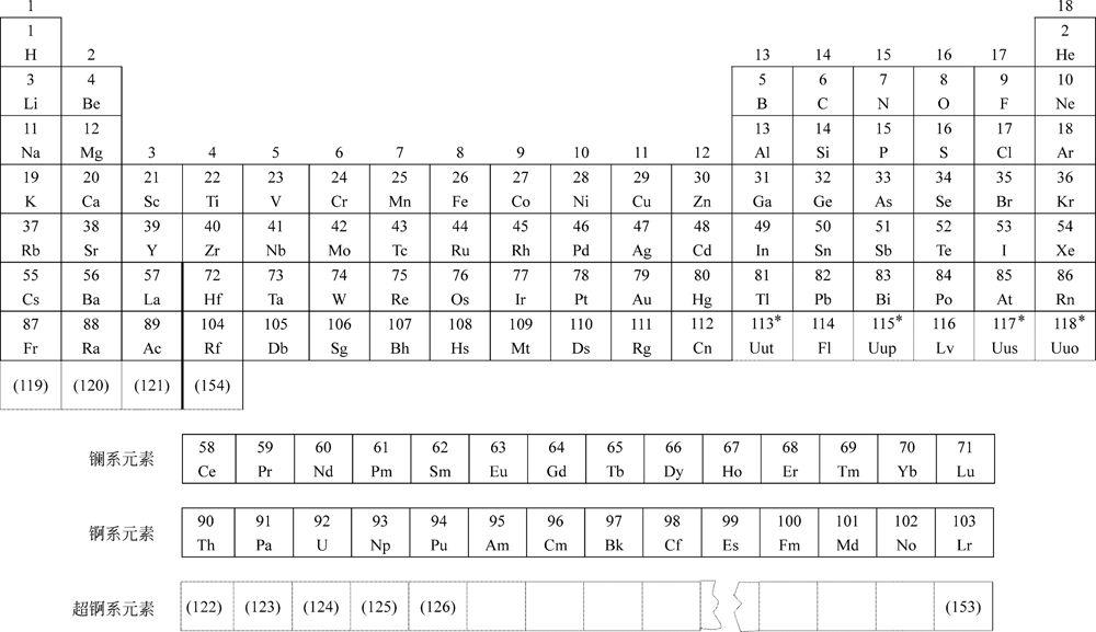 图1-1中,带“*”的元素是2013年时已经报告被合成发现并被其他单位或方法验证过,但尚未被国际纯粹与应用化学联合会(IUPAC)正式承认者,命名为临时的。待发现的元素用括号示出。