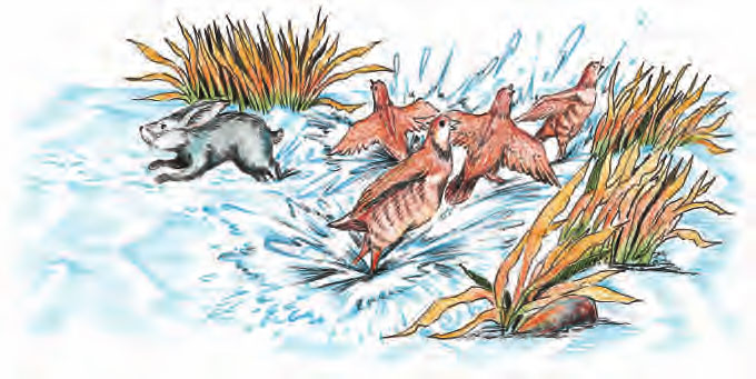 兔子觉得脚下有个活的东西在动。就在这一瞬间,从附近的雪底下,飞起了一大群白鹧鸪,翅膀扑得震天响。兔子吓得魂飞魄散,慌忙跑回了森林。