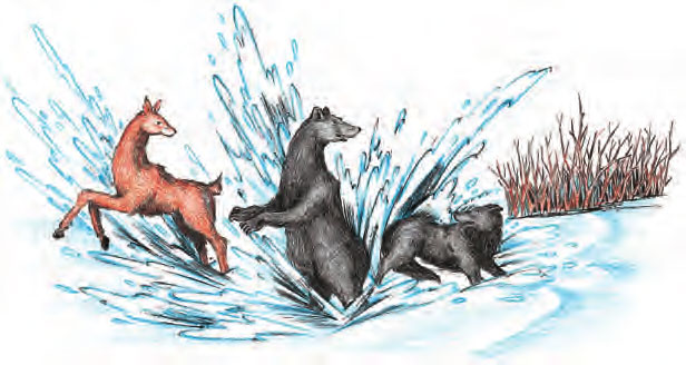 母鹿凭着它的飞毛腿,毫不费力地跳过了倒在地上的树干,向前飞奔。狼紧跟着也跳了起来,但是没有跳过去。它的身子太重了,扑通一声,从树干上掉进了雪里,四条腿一齐陷入了熊洞里。原来熊洞正好在树干底下。