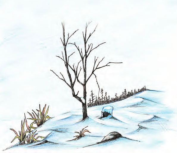 原来有一群白鹧鸪住在沼泽地的雪底下。白天,它们飞出来,在沼泽地上走来走去,挖雪里的蔓越橘吃。它们吃了一阵,又返回到雪底下。