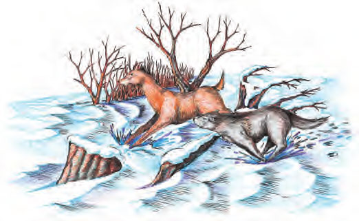 在一棵倒地的大树旁,两种脚印完全混在了一块。看来,母鹿刚刚来得及跳过大树干,狼紧跟着蹿了过去。