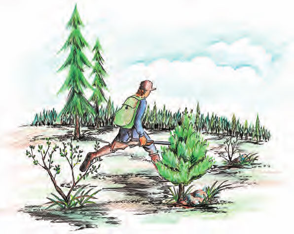 现在猎人离松鸡已经很近了,松鸡就落在这几棵枞树上,离地不远,在半树腰的位置。