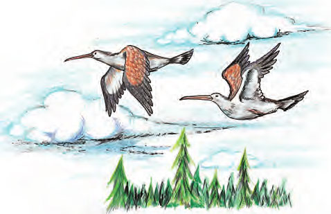 两只长嘴丘鹬,正在空中扑打着翅膀,急速地飞过森林上空。它们一只跟着一只飞,并不是在打架。看得出,雌的飞在前面,雄的跟在后面。