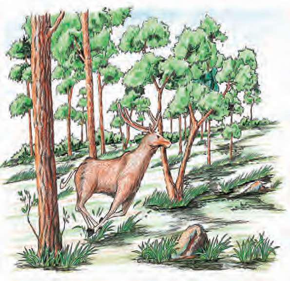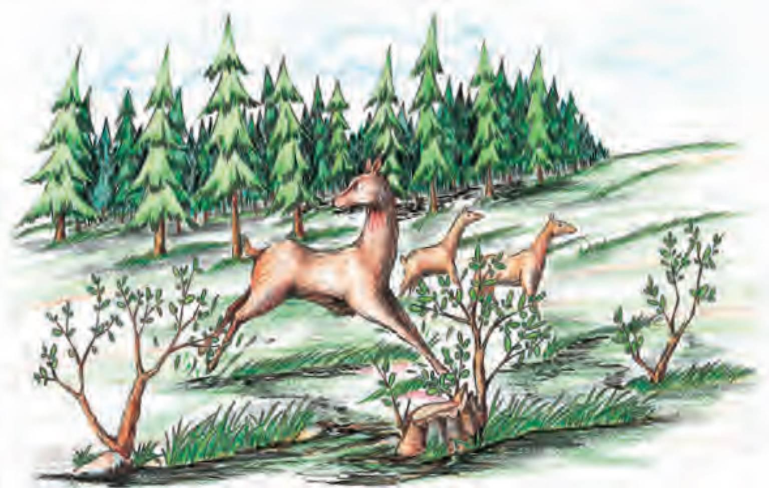 冷不丁,一个黑影从灌木丛里蹿出来,只一蹦,就上了雄獐鹿的背。雄獐鹿倒了下去。雌獐鹿带着小獐鹿逃进了森林。