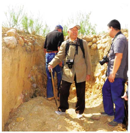 2012年5月18日,袁宝印在挖掘现场向泥河湾保护区现场管理科的同志介绍新发现的“疑似远古人类遗存石铺地面”的挖掘情况(王希桐摄)
