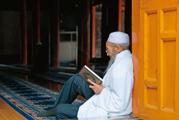 西宁东关清真大寺,礼拜堂门前读经的老者。