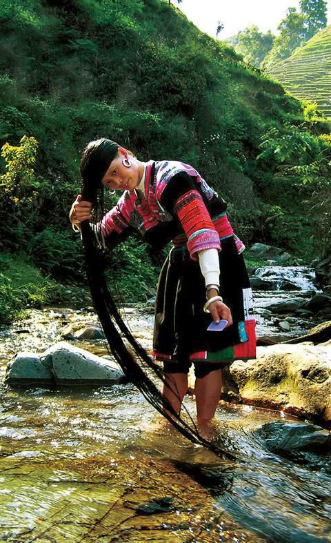 广西的红瑶女人13岁开始蓄发,一生只在16岁剪一次头发,因此她们长长的秀发必须到溪水里才能冲洗干净。
