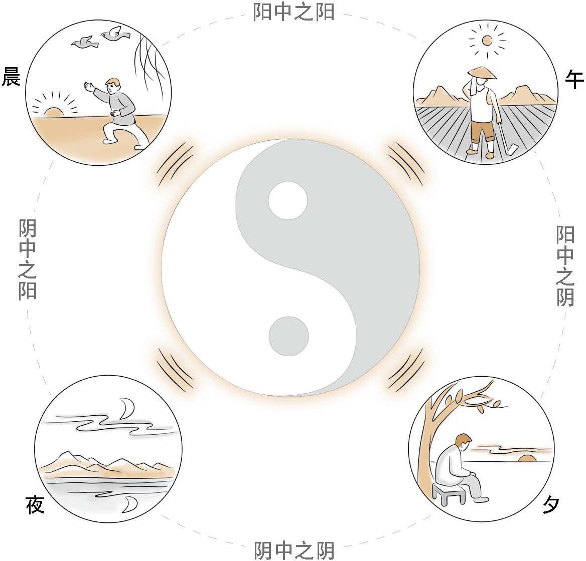 阴阳具无限可分性:即阴阳中复有阴阳。例:昼为阳,夜为阴,而白天的上午与下午相对而言,则上午阳的特征不断增加,因此为阳中之阳,下午太阳西斜,阳的特征渐减,为阳中之阴;黑夜的前半夜与后半夜相对而言,则前半夜阴的特征渐增,为阴中之阴,后半夜阴的特征渐减,为阴中之阳。