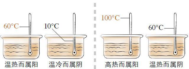 相比较而分阴阳: 单一的事物在没有比较的情况下是难以辨其阴阳的,阴阳的属性只有在相比较的情况下才能确定。例如60℃的水,同10℃的水相比,较温热而属阳;但当60℃的水与100℃的水相比,则较寒凉而当属阴。