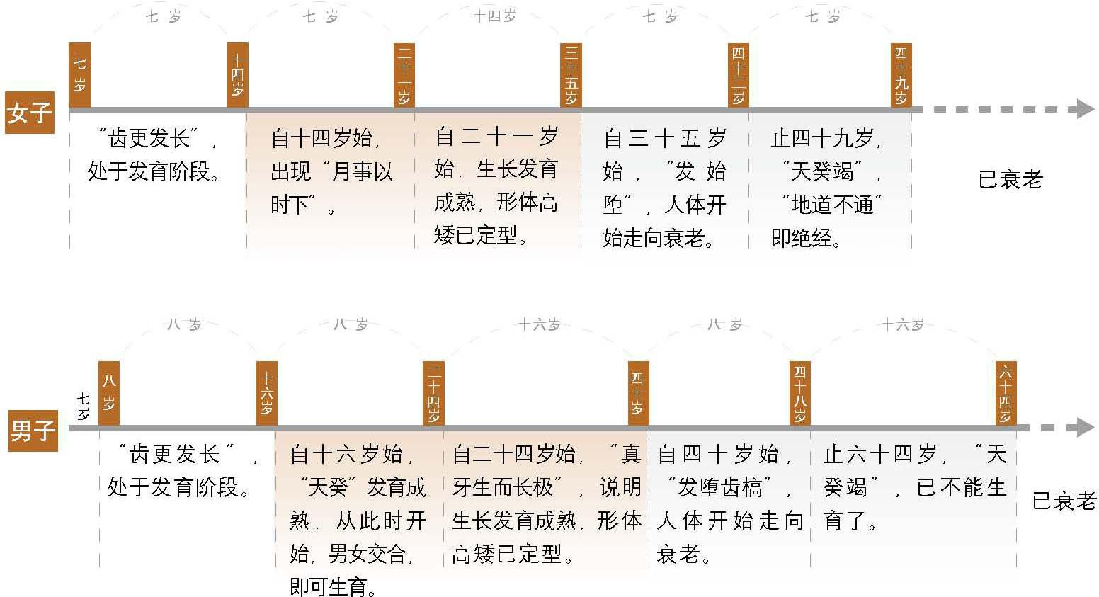 古人在长期的观察与实践中,逐渐对人体生长发育过程,有了规律性的认识。《内经》就详尽地记载了人从生到死的生长周期。如女子以七岁为基数,男子以八岁为基数。大多数女性是经历七个阶段,男性则经历八个阶段,这样就完成了从生长到衰老的过程。