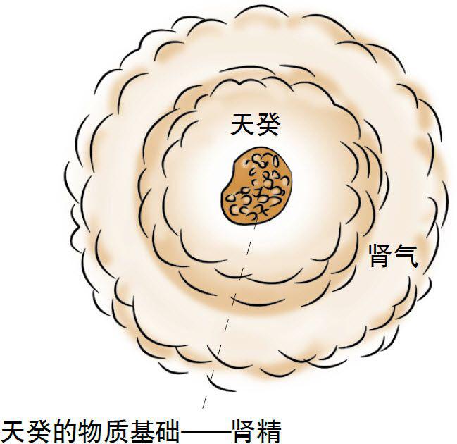 天癸即肾气在主导性与生殖方面的精微体系,也是肾气在育龄阶段产生的特殊内涵,是肾气的一个重要分支。而“气”属阳,必有其物质基础。天癸的物质基础是肾精。而这种肾精便是肾中的先天之精,亦即生殖之精。这种生殖之精并不是自身所生而是父母的生殖之精。由于生殖之精中包含着父母的生命信息,所以天癸在促化人形体发育时,亦将这种信息从各个方面影响子代,这就是遗传。由此可以说,天癸也是人类遗传的重要物质。