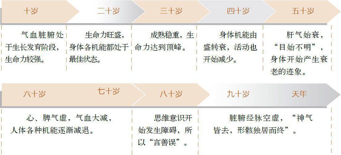 因为生命只有一次,所以人们渴望长寿,希望能够“尽终其天年,度百岁乃去”。所谓天年,就是天赋的年寿,即自然寿命,一个人应该活到的岁数。究竟人应该活到的岁数是多少呢?《内经》认为是100岁,《礼记》称百岁为“期颐”。《尚书》又提出“一曰寿,百二十岁也”,即活到120岁,才能叫做活到了应该活到的岁数。大哲学家王充提出:“百岁之寿,盖人年之正数也。犹物至秋而死,物命之正期也。”晋代著名养生家嵇康认为,“上寿”可达百二十,“古今所同”。看来据上所述,中国传统医学认为人的寿命应该是100~120岁左右。也就是天命之年了。