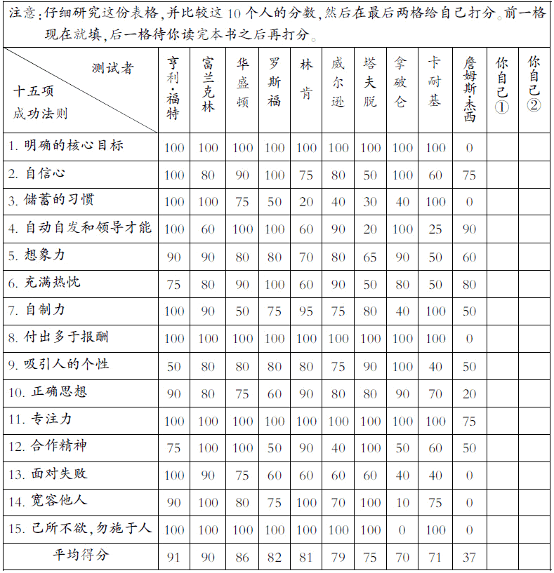 备注:上表所分析的10个人都是世界上最著名的人物,其中8个人是成功的,另外2人詹姆斯·杰西和拿破仑是失败的。他们两人也被加以分析,以供比较。注意这两个人得零分的部分,你就会发现他们失败的原因。在15项成功法则中,只要有一项得到零分,就足以造成失败,尽管其他分数得分很高,仍然无法挽回。