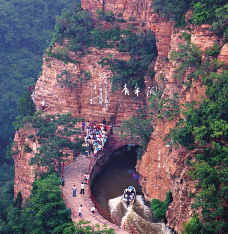 青年洞是红旗渠总干渠主要工程之一,也是总干渠最长的隧道,长623米,高5米,宽6.2米。1960年2月,青年洞工程从全县民工中抽调320名青年先行施工,1961年7月15日凿通隧洞。为表彰青年们艰苦奋斗的业绩,所以将此洞命名为“青年洞”。1973年全国人大常委会副委员长郭沫若亲笔题写了洞名。风景如画的太行山中,青年洞修筑于峭壁之上,飘荡在云雾之间,乘游艇穿行其间,山就在我们的头顶,轻拨渠水,丝丝凉意从指间传递。