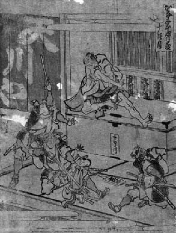 图3 《忠臣藏》一剧中的场景,浪士身着警察的服装。木版画,约1804至1812年