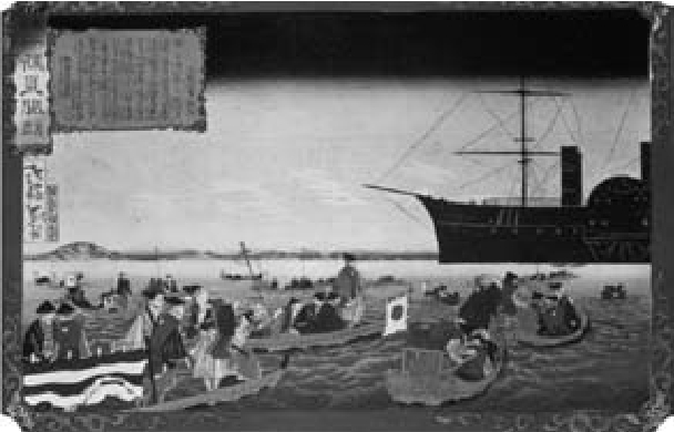 图2 一幅木版画表现了1853年海军准将佩里的明轮汽船抵达浦贺湾的场景