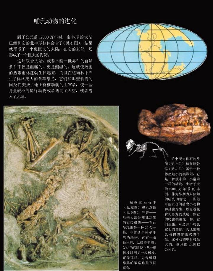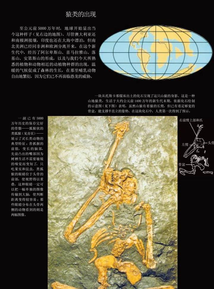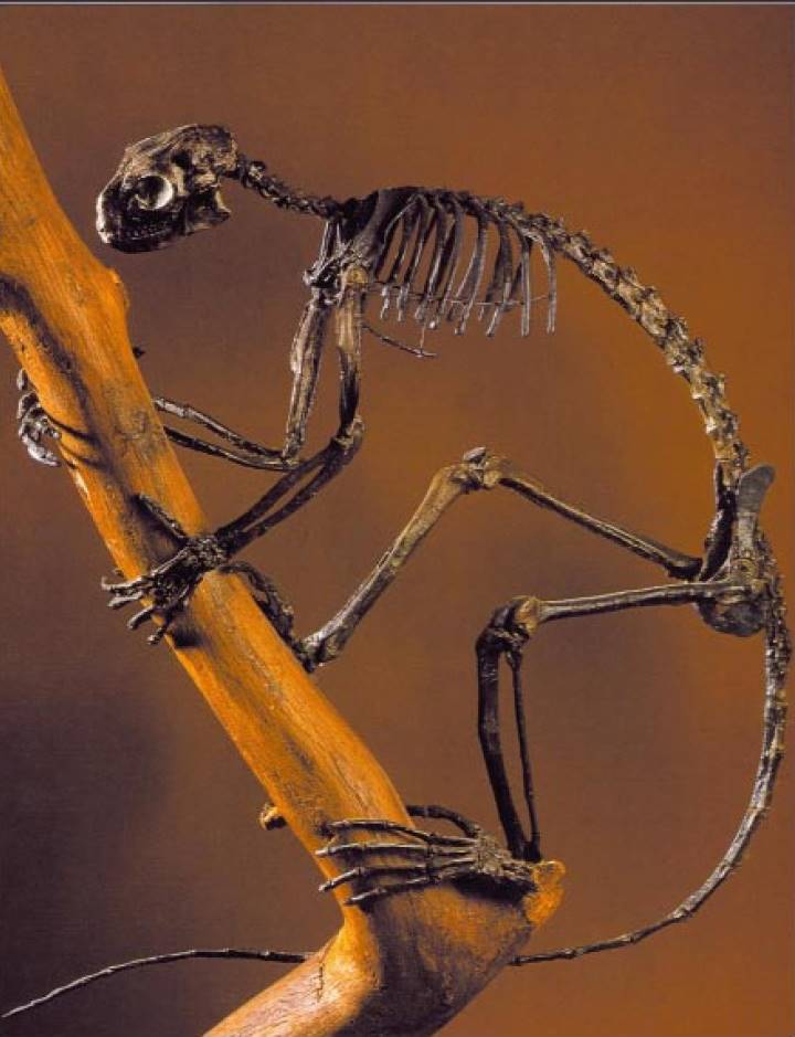 从早期的老鼠一样大小的哺乳动物进化到大个头的哺乳动物,其中就包含了这样一些树栖哺乳动物,它们长着长尾巴、能抓握的爪子和位于头前部而不是头两侧的眼睛。这种晚近才被命名的动物在判断距离方面取得了极大的进步,这对于一只动物迅速地从一根树枝转移到另一根树枝是至关重要的。这是一种灵长类动物,从它们当中,进化出了第一批猿类动物,那是在2000万年前发生的事情。