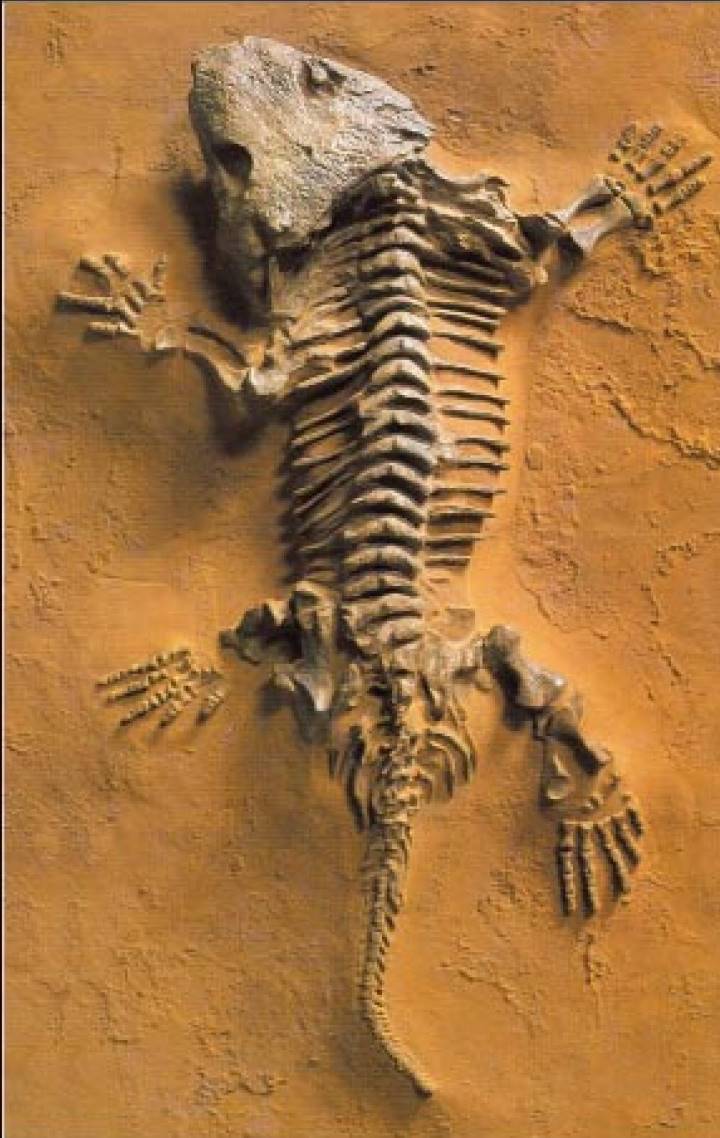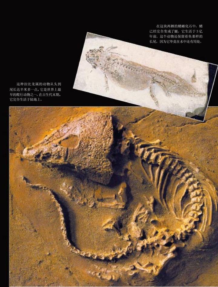在长久的进化中,两栖动物长出了腿和脚,它们在陆地上用起来比鳍更有成效。两栖动物中的一些身量较小者越来越能脱离水而生活了,它们被身量较大的侵犯者驱逐到陆地的深处,因而进化出了适于干燥环境的特征。它们长出了坚韧的、带甲鳞的皮,生出裹着壳的蛋,使胎儿不致受到风干,它们就这样成了第一批爬行动物。右图所示是一只蜥螈的化石,80公分长,长着爬行动物式的坚硬的脊椎骨,脊椎骨下端与骨盆相连,与此相伴的是明显地残留着两栖动物特征,包括弯曲的牙齿以及长在头骨两侧后端的小槽,那是装置耳膜用的。
