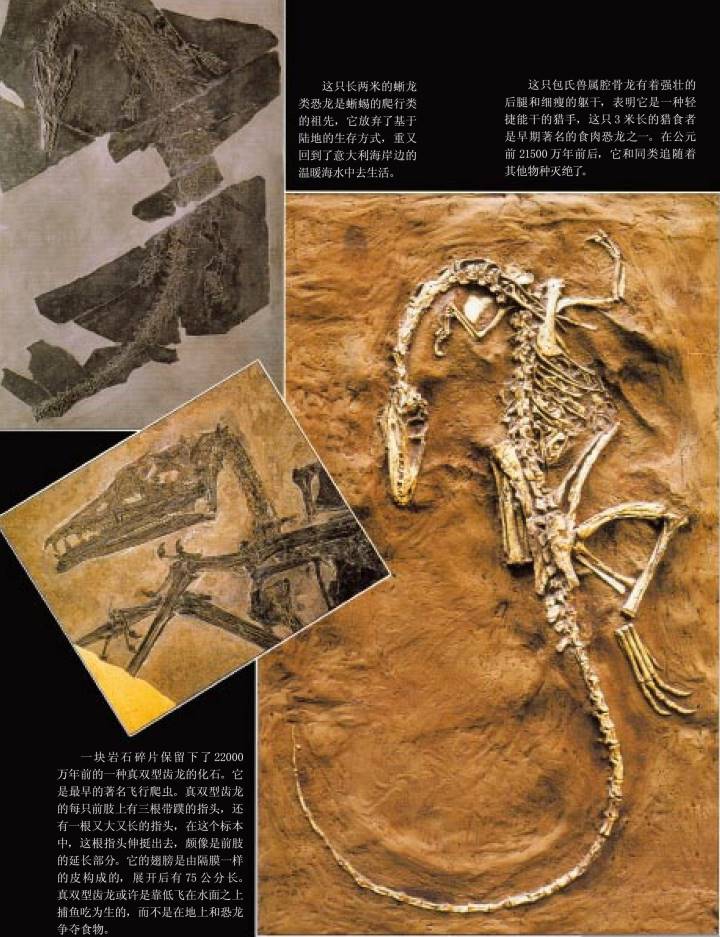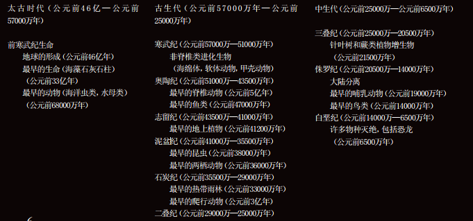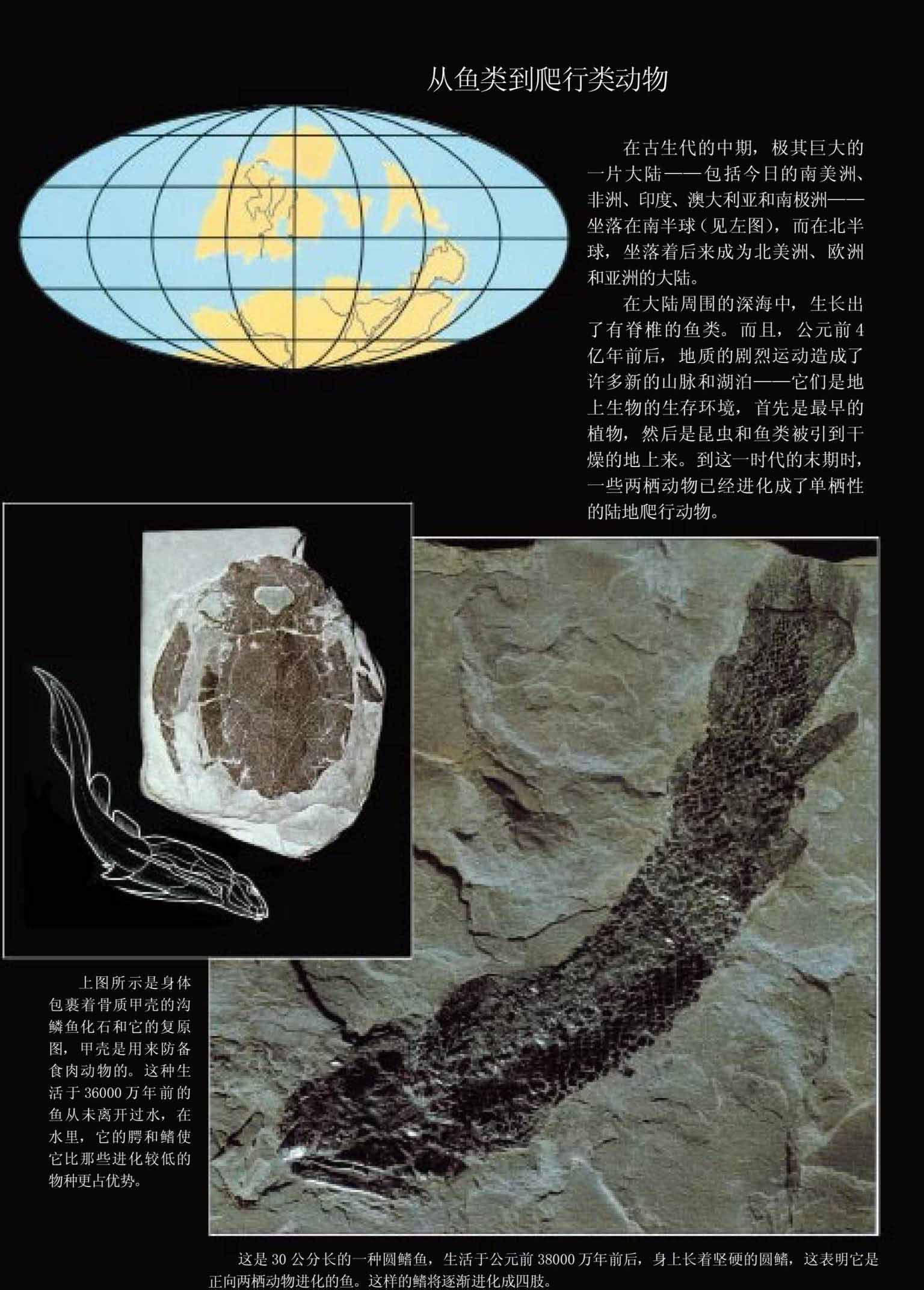 从长有骨骼的鱼类到哺乳动物的猿类,经过了三个进化史上的历程:古生代、中生代和新生代,分别代表着生命史上的老、中、幼三个时代(见下列年表)。这三个时代中生存的部分动物遗留下来的化石,展示在以下的篇幅中。它们在机体上进化出的明显特征表明了这一漫长时期中各大陆在构造上发生的变化带给这些动物的影响——这是一种被浮出海面的大地所发生的持续运动造成的现象。