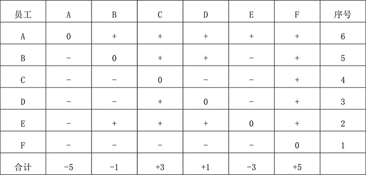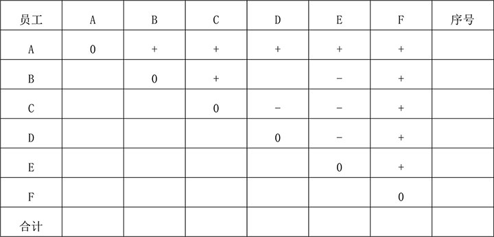 答: 表2-4-3中,将纵列员工与横行员工对比,以横行员工作为对比的基础,如果比本员工优秀,则划"+",如果比本员工差,则划"一"。列表中是以横行的员工作为对比的基础,如果以纵列的员工作为对比的基础,所得的结果正好相反。