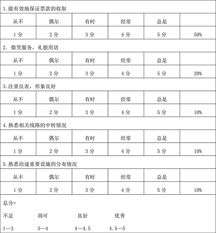 请根据以上内容为售票员设计一张行为观察量表,以评选出公司优秀的员工。设计方案时需考虑各因素权重的不同。